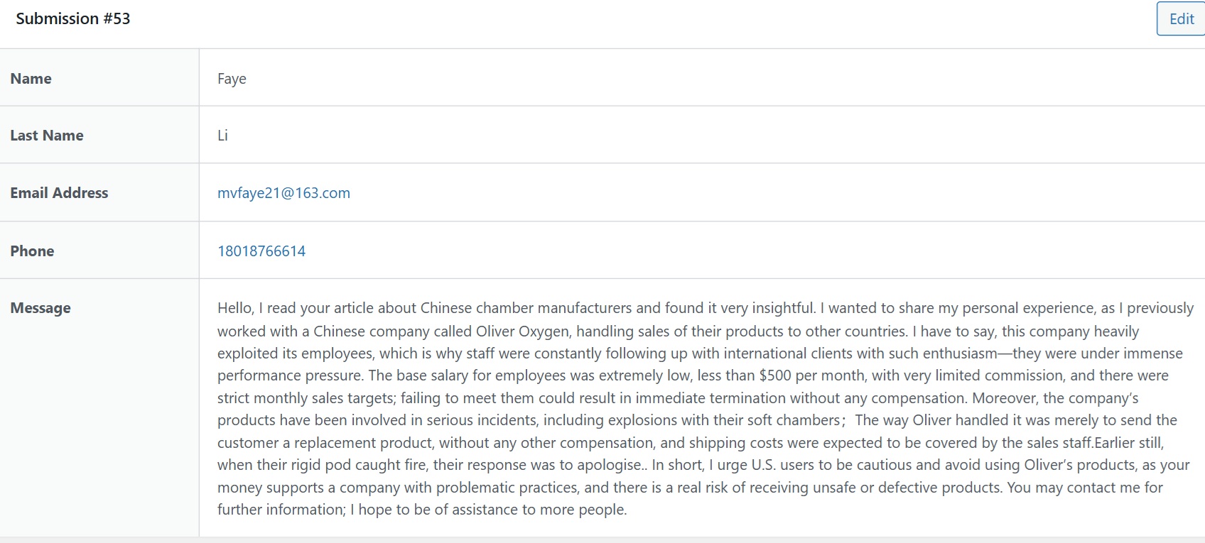 This individual is disadvantaged because he can’t return his chamber. For one, a Chinese manufacturer doesn’t give you a trial period. You purchase site-unseen … in cash! If you have a problem, it is your problem. Additionally, returning a unit back to China costs you upwards from $1200. Although you save some money, upfront, purchasing from China, with a USA distributor you receive the value of safety!