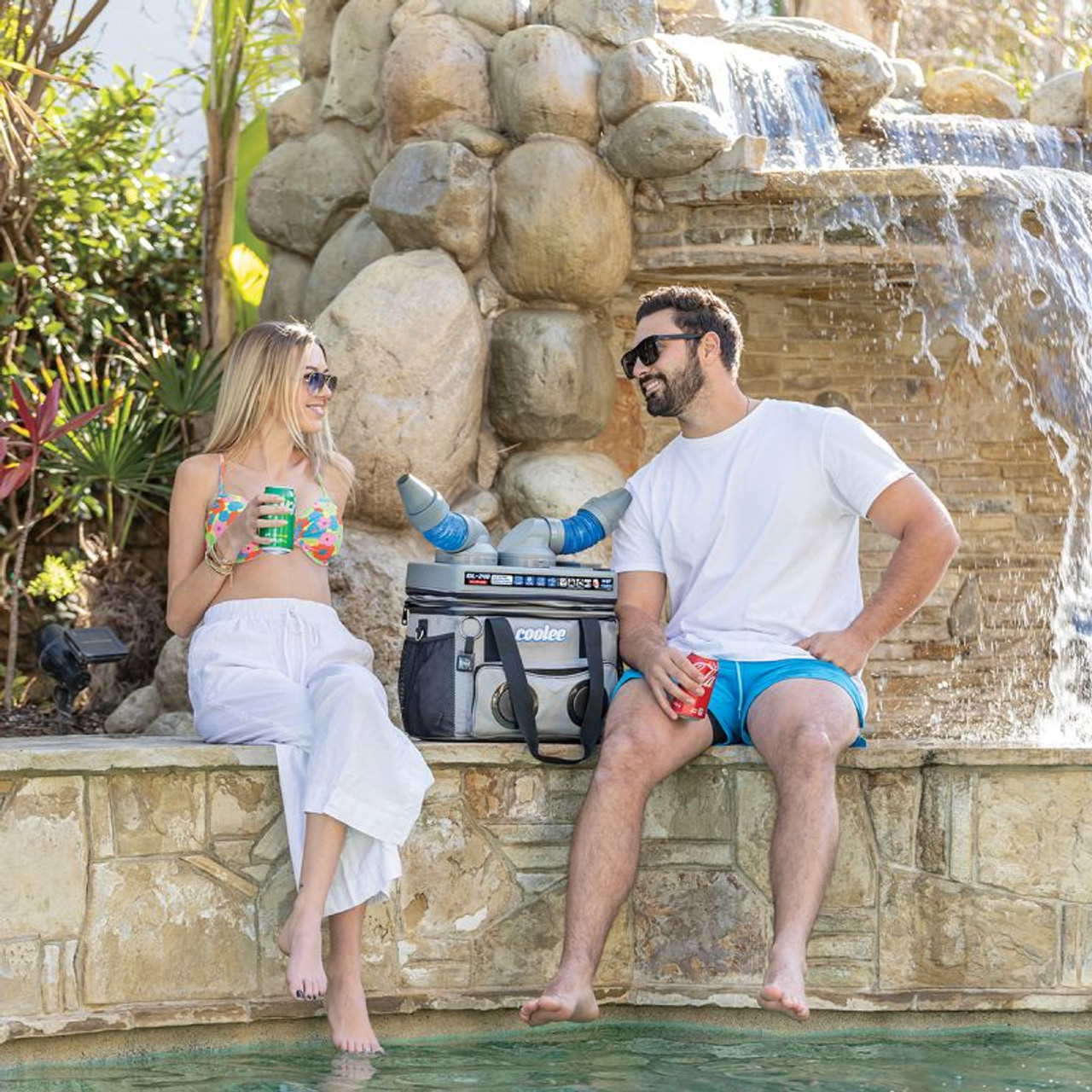 Coolee is rechargeable and includes a battery pack, charger, 110V and 12V power cords, dual airflow nozzles, and a shoulder strap for hands-free portability. If you’re looking for a portable air conditioner alternative that keeps drinks cold and music playing, Coolee does it all.