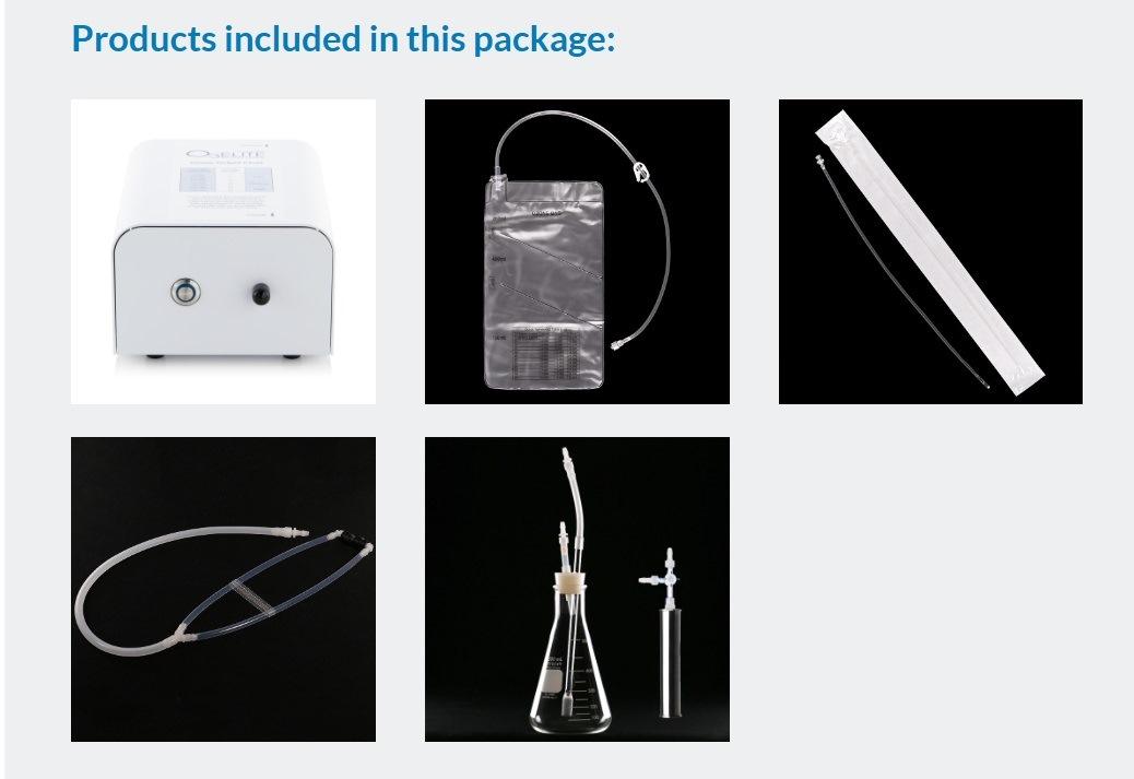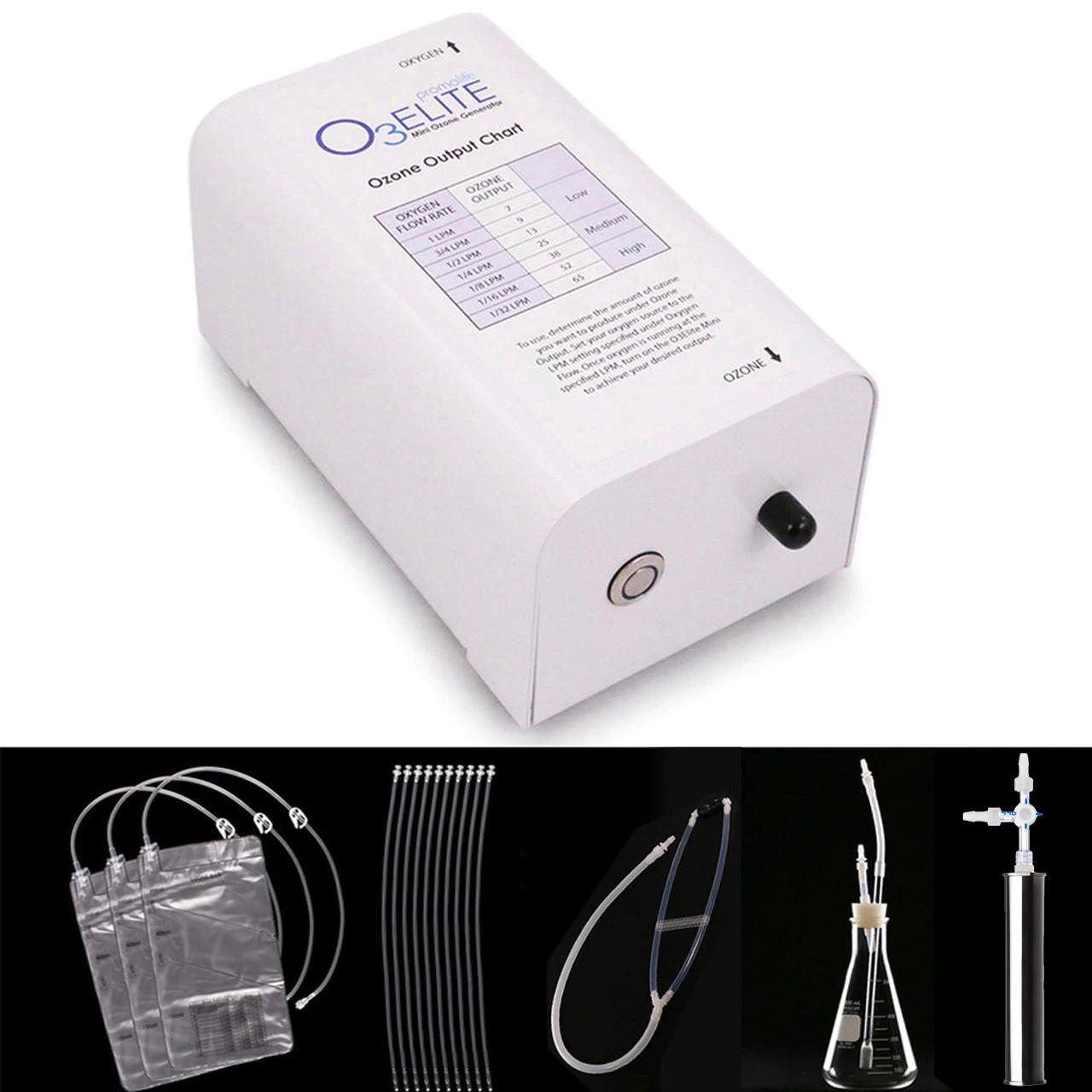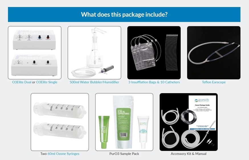 With this package you receive the O3Elite Mini Ozone Generator and the accessories that come with it, three Multi-Chamber Insufflation Bags, 10 Luer Lock catheters, a Teflon earscope, and our Basic Ozone Bubbler/Humidifier Combo.